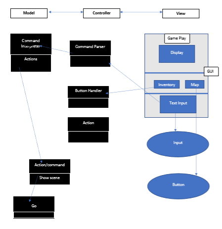The state of the game between situations needs to be maintained so a chunk of the view comes with a model behind it. The characteristics of it – is maintained – the user needs to know where they are at in the game from scene to scene. There are two ways into actions and commands. Classes and inheritance can be used to standardise what happens e.g. a class for all actions can have sub-classes that inherit the top classes standardised methods, can override certain methods to specialise an action.